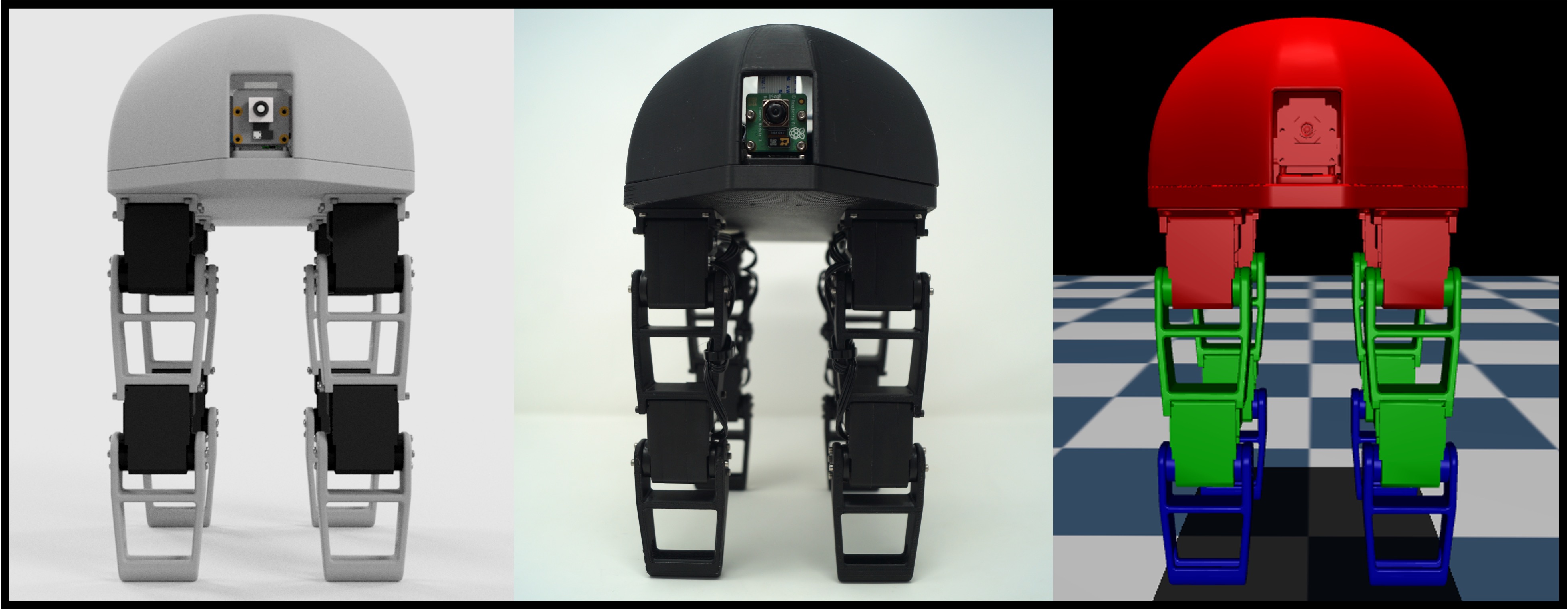 The robot is consistent between CAD, real world manufacture, and simulation, allowing us to run design optimization as well as gait optimization and learning.